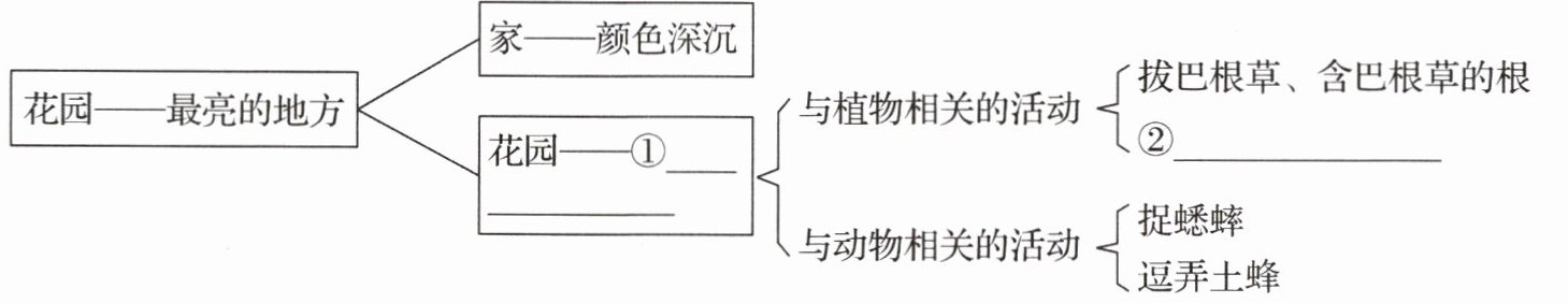 8. ①红色 ②碰臭芝麻 9. 不可以删去。开头写家的情况是为了引出下文对花园的回忆;家在“我”的记忆里是深沉的,是黑色的,与花园给“我”的印象是红色的形成对比,突出花园给“我”的童年带来了快乐,所以不能删去。 10. 示例一:这句话运用“掏”“扒”“灌”“扑”“追”等一系列动词,生动形象地写出了“我”捉蟋蟀时的过程和情态,富有情趣,表现了童年时光的快乐。 示例二:这句话运用短句,节奏短促,简洁明快,活泼有力,生动形象地写出了“我”捉蟋蟀时的过程和情态,富有情趣,表现了童年时光的快乐。 11. 鲁迅对童年趣事的回忆,表现的是儿童时代对自然的热爱、对知识的追求,以及儿童的天真活泼、无忧无虑。如对百草园景物的描写,听蟋蟀弹琴,翻蜈蚣,按斑蝥,拔何首乌根,摘覆盆子,等等,都表明了这一点。汪曾祺对童年趣事的回忆,力求展现真实自然的生活,用简单朴实的语言展示自然界的生命之美,如选文中拔巴根草、含巴根草的根、捉蟋蟀、逗弄土蜂等,都写得富有生活情趣,表达了作者对生命的热爱,对愉悦平淡生活的向往。两文都是对童年趣事的回忆,表达的情感态度之所以不同,在于两位作者对生活的认识不同。《朝花夕拾》记录了鲁迅从幼年到青年时期的生活和心路历程,以成年人的视角来看待童年生活,回忆童年生活的快乐无忧;而汪曾祺则是真实地记录童年往事,他追求的是平淡、自然、“家常”的生活态度,因此在作品中也力求体现这一点。