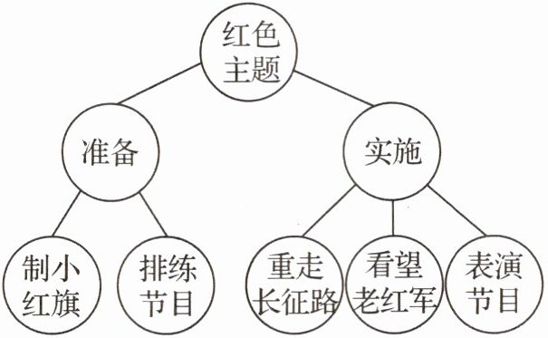示例:本次活动以“红色主题”为中心,分准备和实施两个阶段。在准备阶段,要制作小红旗和排练节目;在实施阶段,要重走长征路,看望老红军,最后表演节目。