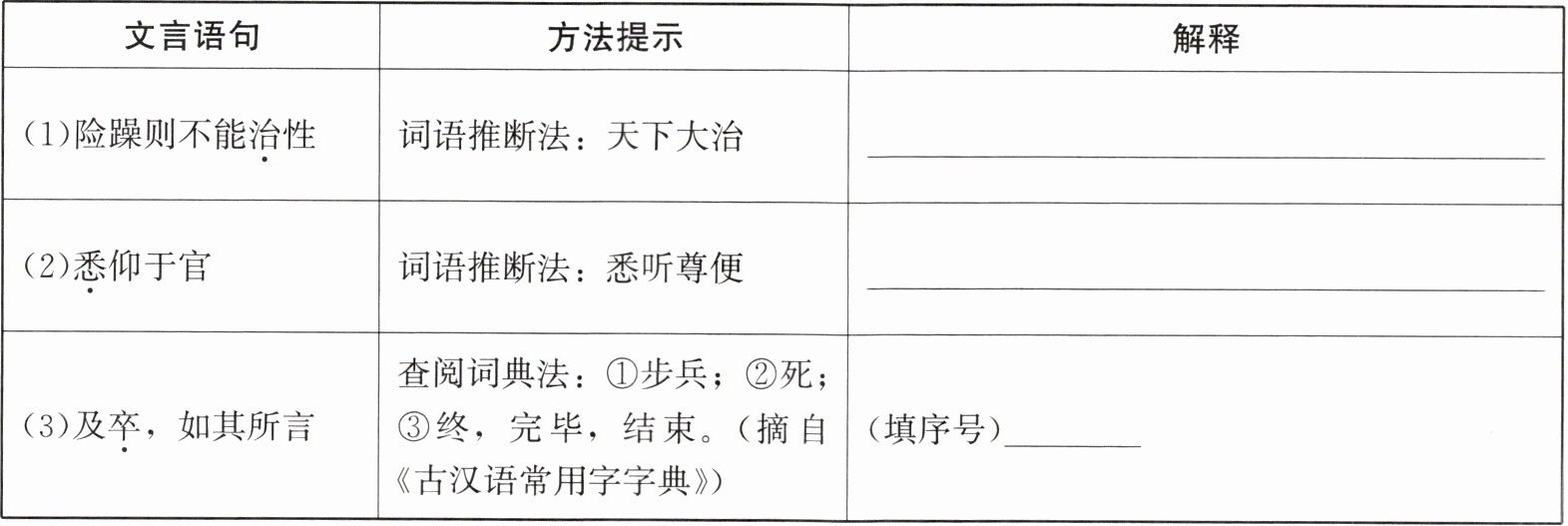 ,如其所言|查阅词典法:①步兵;②死;③终,完毕,结束。(摘自《古汉语常用字字典》)|(填序号)____|6. 把下面句子翻译成现代汉语。