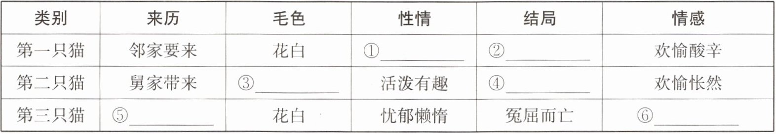 |第二只猫|舅家带来|③______|活泼有趣|④______|欢愉怅然|