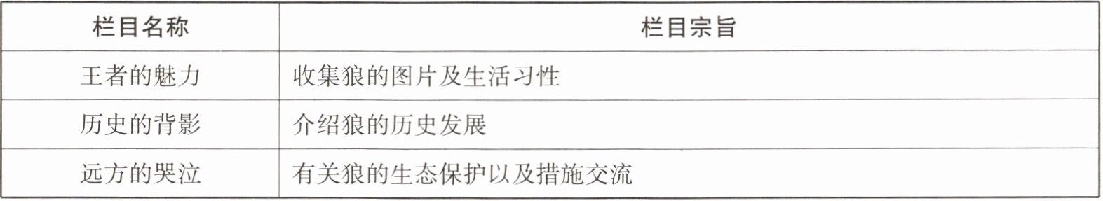 (2)班上要建立一个“与狼为伍”的网站,目的是希望每个人都能了解狼。下表是这个网站上目前已经设立的三个栏目的名称及栏目宗旨。