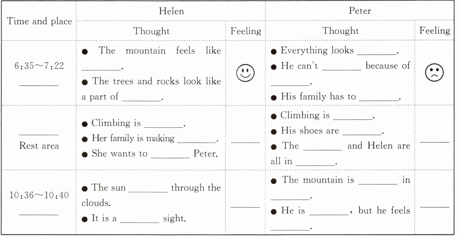 Helen和Peter体验了黄山之旅,深切感受到天气变化对旅游体验的深刻影响。他们的黄山之旅是怎样度过的呢?请你完成以下表格。