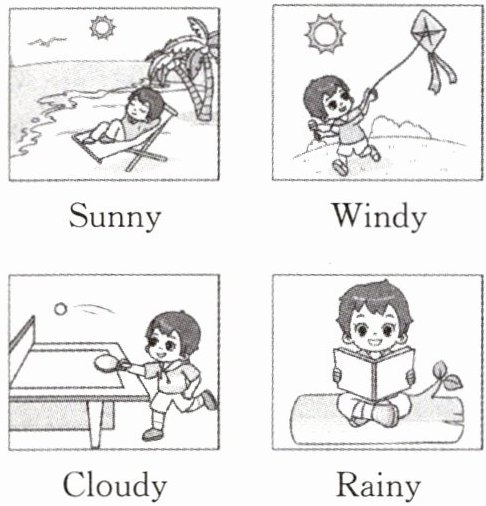 On sunny days, I like to lie on the beach and it makes me relaxed. I like to fly a kite in the park on windy days. On cloudy days, playing ping-pong with my classmates is my favourite. On rainy days, reading books at home is the best activity.