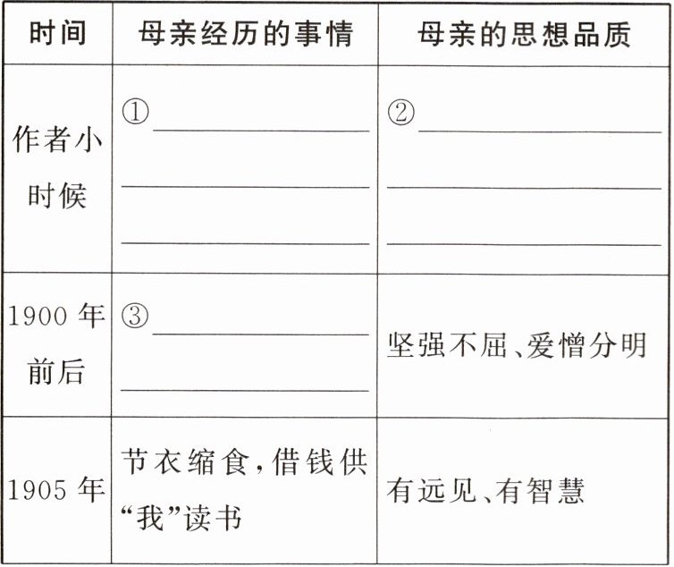 1. 跳读课文,勾画出表明时间的词语,思考:这些时间母亲经历了什么事情?表现了母亲怎样的思想品质?