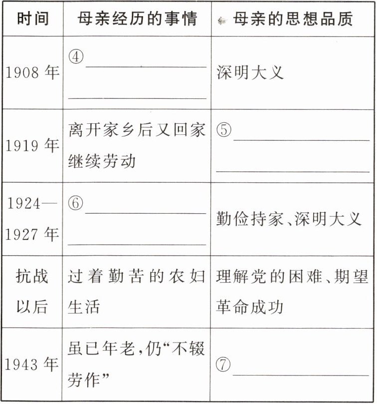 1. ①母亲整天劳作,承担家中各项事务 ②聪明能干,任劳任怨,勤劳俭朴,宽厚仁慈 ③遭遇退佃、搬家和天灾的打击 ④支持、慰勉儿子参加革命 ⑤一生勤劳 ⑥独立支持一家人的生活 ⑦热爱劳动