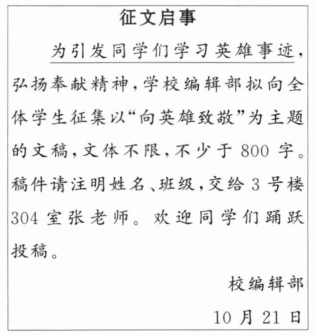 10. 学校正在开展以“向英雄致敬”为主题的征文活动,请你参加。