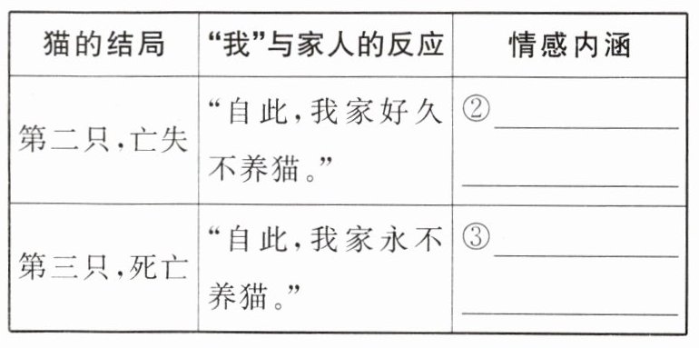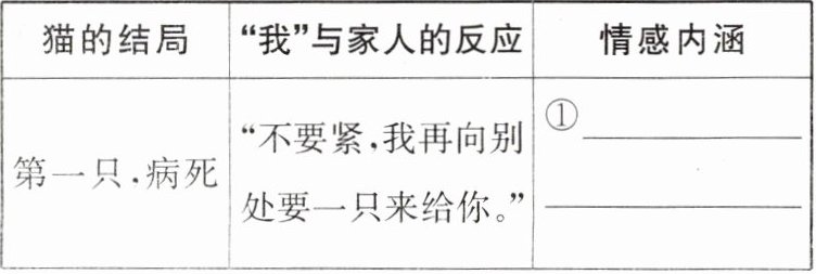 1. 根据猫的结局和“我”与家人的反应,分析语句背后的情感内涵。