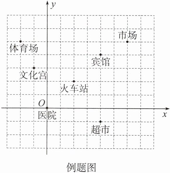 例 小明给右图建立平面直角坐标系,使医院的坐标为$(0,0)$,火车站的坐标为$(2,2)$。