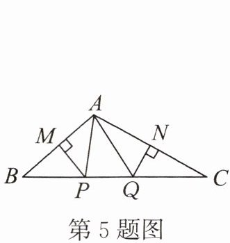 5. 如图所示,在$\triangle ABC$中,$PM$,$QN分别是线段AB$,$AC$的垂直平分线。若$\angle PAQ = 40^{\circ}$,则$\angle BAC$的度数是(