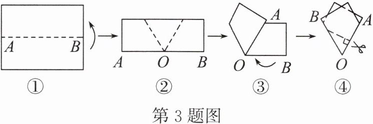 3. 如图所示,把一张长方形纸片对折,折痕为 $ AB $,再以 $ AB $ 的中点 $ O $ 为顶点,把平角 $ \angle AOB $ 三等分,沿平角的三等分线折叠,将折叠后的图形剪出一个以 $ O $ 为顶点的直角三角形,那么剪出的直角三角形全部展开铺平后得到的平面图形一定是(