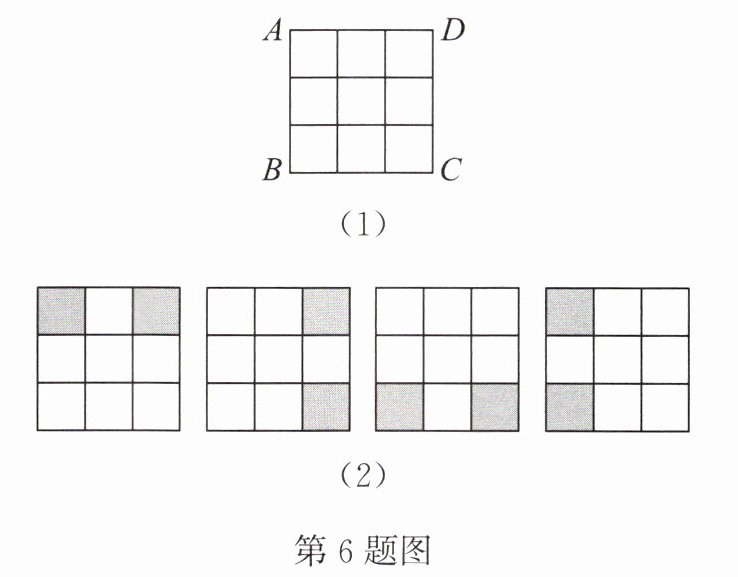 6. 如图(1)是 $ 3 × 3 $ 正方形方格,将其中两个方格涂黑,并且使得涂黑后的整个图案是轴对称图形。约定绕正方形 $ ABCD $ 的中心旋转能重合的图案都视为同一种图案,例如图(2)中的四幅图就视为同一种图案,则得到的不同图案共有(