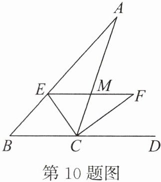 10. 如图,在$\triangle ABC$中,$CE平分\angle ACB$,$CF平分\angle ACD$,且$EF// BC$,$EF与AC交于点M$。若$CM = 5$,求$CE^{2}+CF^{2}$的值。