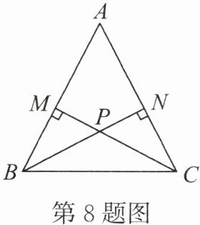 8. 如图,在$\triangle ABC$中,$AB = AC$,$\triangle ABC的高BN$,$CM交于点P$。