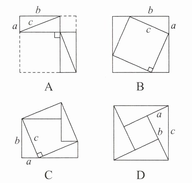4. 我国古代数学家赵爽最早证明了勾股定理,它标志着我国古代的数学成就。下面四幅图是由四个全等的直角三角形拼成的,其中不能证明勾股定理的是(