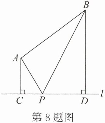 8. 如图,点A,B是直线l同侧的两点,且点A,B到l的距离分别为4.5,10.5,且垂足点C,D间的距离为8。若点P是l上的一点,求PA+PB的最小值。