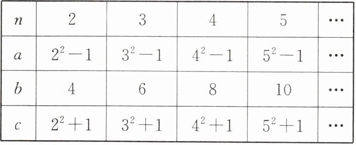 (1)请你分别观察$a$,$b$,$c与n$之间的关系,并用含自然数$n(n>1)$的代数式表示: