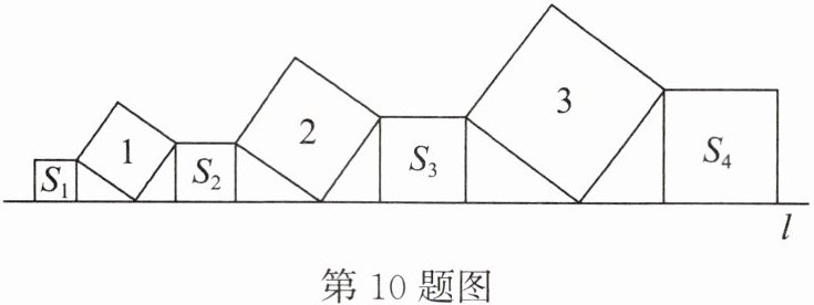 10. 在直线$l$上依次摆放着七个正方形(如图所示),已知斜搁置的三个正方形的面积分别是1,2,3,正搁置的四个正方形的面积依次是$S_{1}$,$S_{2}$,$S_{3}$,$S_{4}$,则$S_{1}+S_{2}+S_{3}+S_{4}= $