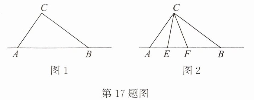 17. (10分)台风是一种自然灾害,它以台风中心为圆心在周围上百千米的范围内形成极端气候,有极强的破坏力。如图1所示,有一台风中心沿东西方向$AB由A向B$移动,已知点$C$为一海港,且点$C与直线AB上的两点A$,$B的距离分别为AC = 300$km,$BC = 400$km,又$AB = 500$km,以台风中心为圆心周围250 km以内为受影响区域。