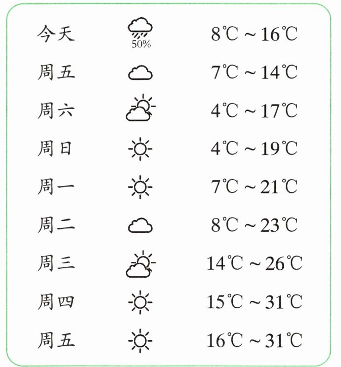 这是一道语文四年级的题目,考查的是对天气预报信息的理解和应用能力,需要根据给定的天气预报内容,以冬冬的身份给妈妈提出出差一周的提醒建议。解题的关键在于准确解读天气预报中的各项信息,包括天气状况(如降雨、多云、晴天等)和气温范围,然后结合这些信息给出合理的提醒,比如是否需要带雨具、适合穿着的衣物等。