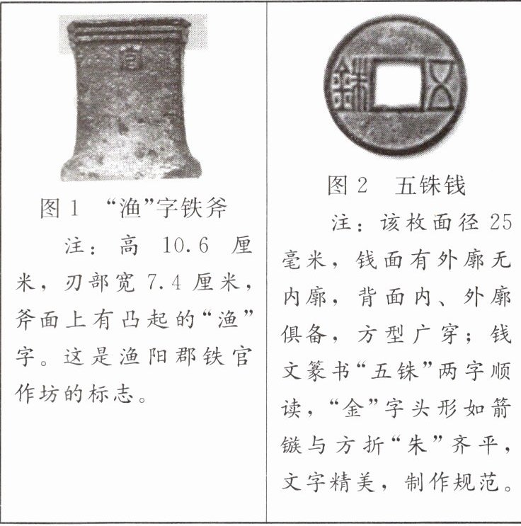 |注:高10.6厘米,刃部宽7.4厘米,斧面上有凸起的“渔”字。这是渔阳郡铁官作坊的标志。|注:该枚面径25毫米,钱面有外廓无内廓,背面内、外廓俱备,方型广穿;钱文篆书“五铢”两字顺读,“金”字头形如箭镞与方折“朱”齐平,文字精美,制作规范。|