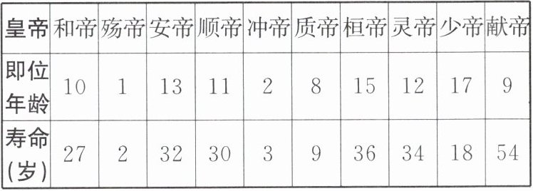1. 下表显示了东汉中后期10个皇帝的即位年龄及寿命,与下表所示现象相关的是( )。