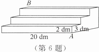 6. 如图所示的是一个三级台阶,它的每一级的长、宽、高分别为 $ 20 dm $,$ 3 dm $,$ 2 dm $,$ A $ 和 $ B $ 是这个三级台阶的两个相对的端点,点 $ A $ 有一只蚂蚁,想到点 $ B $ 去吃可口的食物,则蚂蚁沿着台阶面到点 $ B $ 的最短路程是