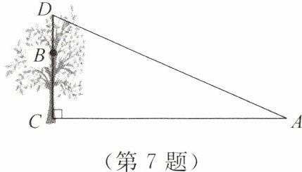 7. 如图,在动物园里有两只猴子在一棵树 $ CD $ 上的点 $ B $ 处, $ BC = 5 \ m $,它们都要到池塘 $ A $ 处吃东西。其中一只猴子甲先沿树爬至树底 $ C $ 处,再沿 $ CA $ 走到离树 $ 24 \ m $ 处的池塘 $ A $ 处。另一只猴子乙先爬到树顶 $ D $ 处,再沿缆绳 $ DA $ 滑到 $ A $ 处。已知猴子甲经过的路程比猴子乙经过的路程多 $ 2 \ m $,设 $ BD = x \ m $。