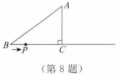 8. 如图,在 $ Rt\triangle ABC $ 中, $ \angle ACB = 90° $, $ AB = 5 \ cm $, $ AC = 3 \ cm $,动点 $ P $ 从点 $ B $ 出发沿射线 $ BC $ 以 $ 1 \ cm/s $ 的速度移动,设运动的时间为 $ t \ s $。