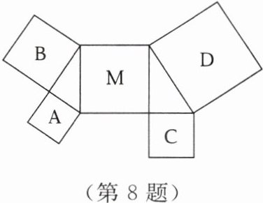 8. 如图,四边形$A$,$B$,$C$,$D$,$M$都是正方形,由正方形的边围成的两个三角形都是直角三角形,正方形$A$,$B$,$C的面积分别是2$,$4$,$3$,则正方形$D$的面积是