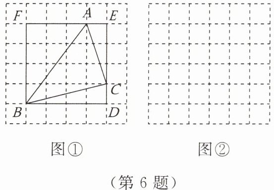 操作发现:如图,在$6 × 6$的正方形网格中,每个小正方形的边长均为$1$,在图①中画出$\triangle ABC$,同时构造正方形$BDEF$,且它的边$DE$,$EF分别经过点C$,$A$,借助此图便可求出$\triangle ABC$的面积。