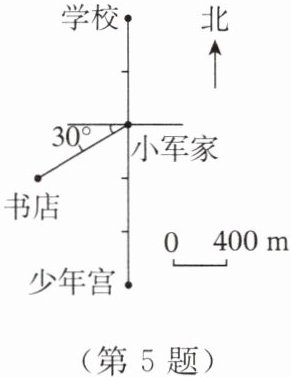 m;(3)花店在小军家南偏东$30^{\circ}$方向400m处,请在图中标示出来。