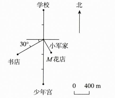 (3)花店在小军家南偏东$30^{\circ}$方向400m处,请在图中标示出来。