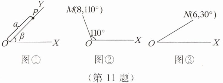 11. 【数学应用】如图①,将射线$OX按逆时针方向旋转\beta$角,得到射线$OY$,如果点$P为射线OY$上一点,且$OP = a$,那么我们规定用$(a,\beta)表示点P$在平面内的位置,并记为$P(a,\beta)$。例如,图②中,如果$OM = 8$,$\angle XOM = 110^{\circ}$,那么点$M在平面内的位置记为M(8,110^{\circ})$。根据图形,解答下面的问题:
