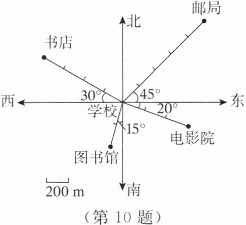 书店在学校的西偏北$30^{\circ}$方向$200×4 = 800m$处;
