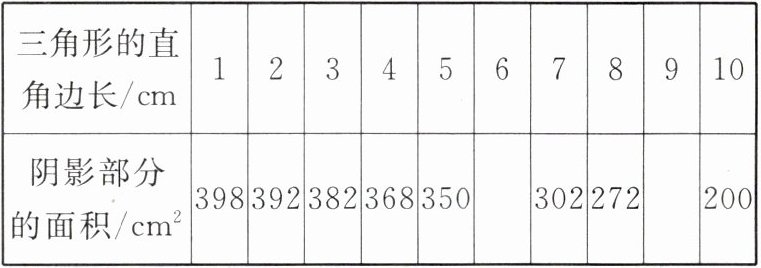| 阴影部分的面积/cm^2 | $398$ | $392$ | $382$ | $368$ | $350$ | | $302$ | $272$ | | $200$ |