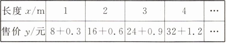 |售价 $y/\mathrm{元}$| $8 + 0.3$ | $16 + 0.6$ | $24 + 0.9$ | $32 + 1.2$ |…|