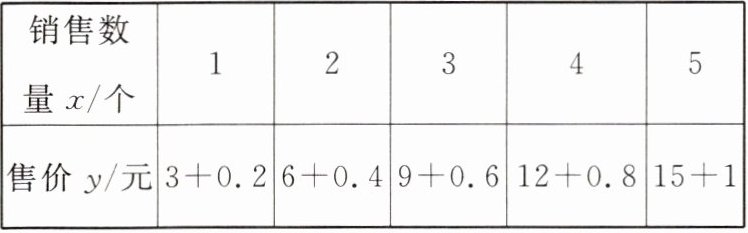 |售价 $y/\mathrm{元}$| $3 + 0.2$ | $6 + 0.4$ | $9 + 0.6$ | $12 + 0.8$ | $15 + 1$ |