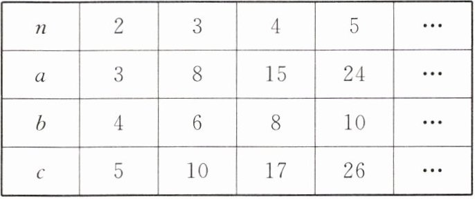 由上表可知,当 $ n = 2 $ 时,$ a = 3 $,$ b = 4 $,$ c = 5 $;当 $ n = 3 $ 时,$ a = 8 $,$ b = 6 $,$ c = 10 $。