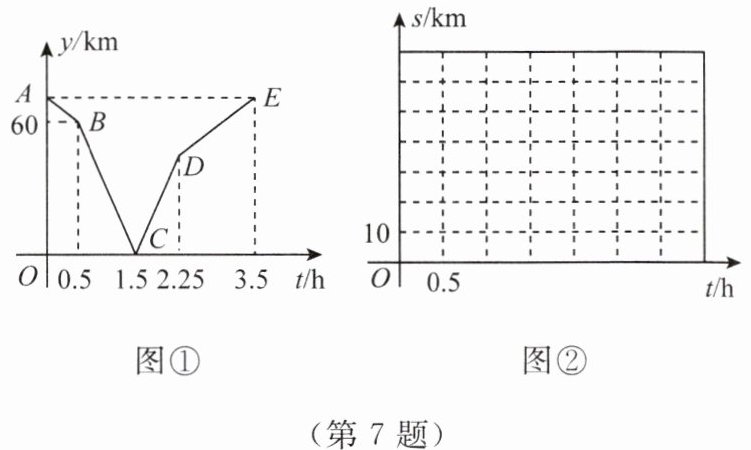 7. 甲骑自行车从 $ M $ 地出发沿一条公路匀速前往 $ N $ 地,乙骑摩托车从 $ N $ 地出发沿同一条公路匀速前往 $ M $ 地,已知乙比甲晚出发 $ 0.5h $ 且先到达目的地。设甲行驶的时间为 $ t(h) $,甲、乙两人之间的距离为 $ y(km) $,$ y $ 与 $ t $ 之间的关系如图 ① 所示,请解决以下问题: