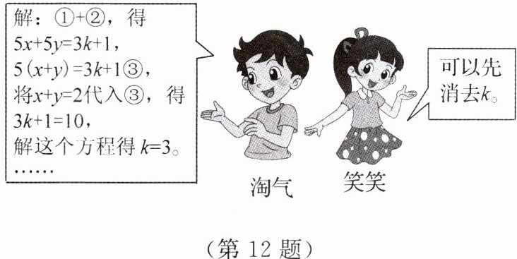 12. 如图,淘气、笑笑两位同学在学习过程中遇到这样一个问题:二元一次方程组$\begin{cases}2x + 3y = 2k + 3①, \\3x + 2y = k - 2②\end{cases} 的解满足x + y = 2$,求$x$,$y$,$k$的值。