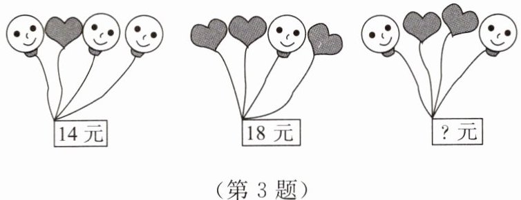 3. 陈老师打算购买气球装扮活动会场,已知气球有笑脸和爱心两种,两种气球的价格不同,但同一种气球的价格相同。由于会场布置需要,购买时以一束(4个气球)为单位。第一、二束气球的价格如图所示,则第三束气球的价格为(