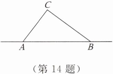 14. 【数学应用】台风是一种自然灾害,有极强的破坏力。如图,台风中心沿东西方向由 $ A $ 向 $ B $ 移动,已知 $ C $ 为一海港,且 $ AC = 300\,km $,$ BC = 400\,km $,$ AB = 500\,km $,台风中心的移动速度为 $ 25\,km/h $。经测量,距离台风中心 $ 260\,km $ 及以内的地区会受到影响。海港 $ C $ 会受到台风影响吗?若会受到台风影响,请求出受影响的时间有多长;若不会受到台风影响,请说明理由。