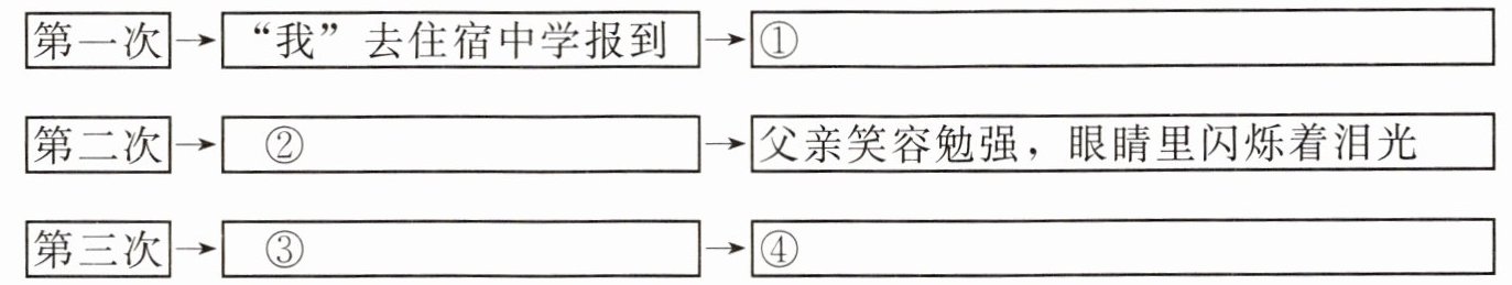 1. 选文围绕“挥手”这个中心,叙述了父亲送“我”远行的三次经历。请结合选文内容,完成下图。