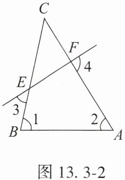 4. 如图 13.3 - 2,$EF与\triangle ABC的边BC$,$AC$相交,则$∠1 + ∠2$