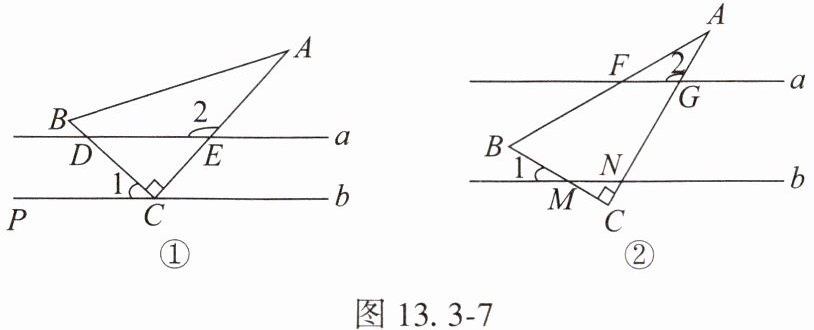 (2) 小颖同学将图 13. 3 - 7①中的直线 $a$,$b$ 均向上平移并旋转 $\triangle ABC$ 得到图 13. 3 - 7②,若 $\angle 2 = 4\angle 1$,求 $\angle 1$ 的度数.