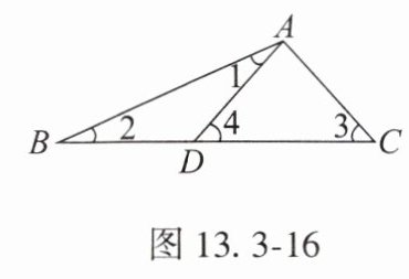 2. 如图 13.3 - 16,在$\triangle ABC$中,$D为BC$上一点,$\angle 1= \angle 2$,$\angle 3= \angle 4$,$\angle BAC = 108^{\circ}$,则$\angle DAC$的度数为(