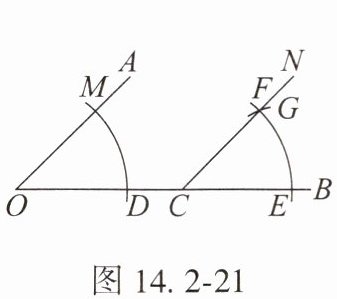 2. 如图 14.2 - 21,点 $C$ 在 $\angle AOB$ 的边 $OB$ 上,用无刻度的直尺和圆规作 $\angle BCN= \angle AOC$,尺规作图的依据是