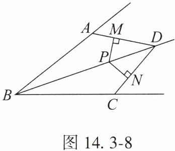 7. 如图 14.3 - 8,$ BD $ 是 $ \angle ABC $ 的平分线,$ AB = BC $,点 $ P $ 在 $ BD $ 上,$ PM \perp AD $,$ PN \perp CD $,垂足分别是 $ M $,$ N $。求证:$ PM = PN $。