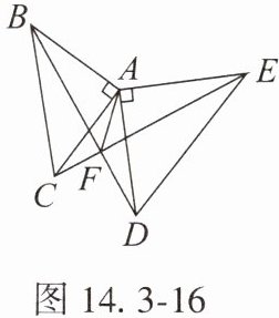5. 如图 14.3 - 16,已知在 $\triangle ABC$ 和 $\triangle ADE$ 中,$AB = AC$,$AD = AE$,$\angle BAC= \angle DAE = 90^{\circ}$,$BD$,$CE$ 交于点 $F$,连接 $AF$。给出下列结论:① $BD = CE$;② $BF\perp CE$;③ $AF$ 平分 $\angle BAD$;④ $\angle AFE = 45^{\circ}$。其中正确的是