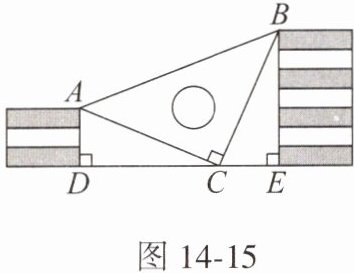 17. (6分)如图14-15,小明用大小相同、高度均为$3cm$的10块小长方体垒了两堵与地面垂直的木墙$AD$,$BE$,当他将一个含$45^{\circ}角的三角尺ABC$如图放置时,直角顶点$C正好在水平线DE$上,锐角顶点$A和B$分别与木墙的顶端重合,求两堵木墙之间的距离.